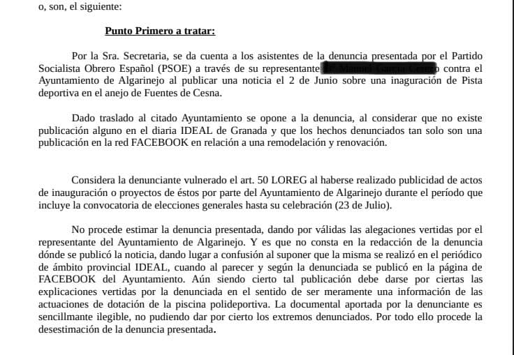 Sobre La denuncia vertida por el PSOE Contra el AYUNTAMIENTO de Algarinejo